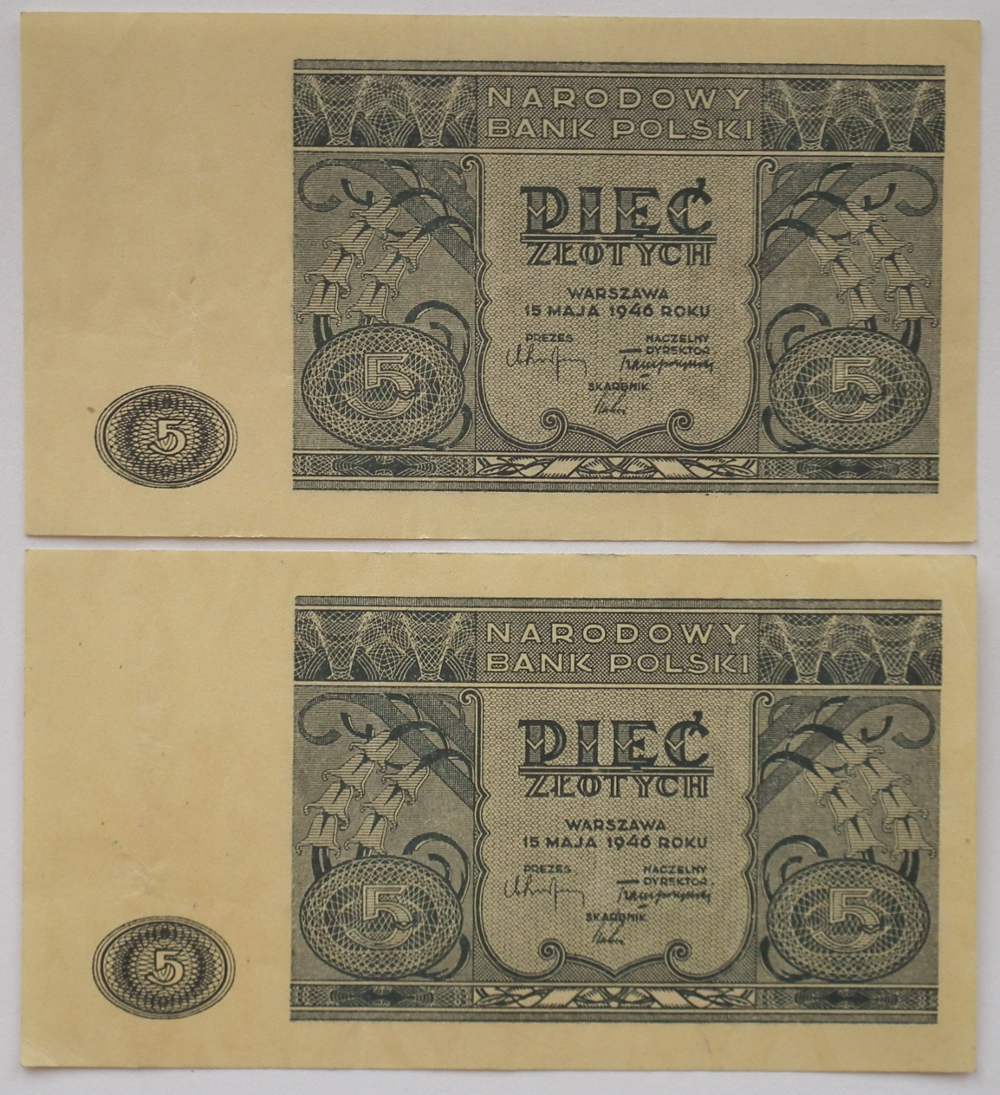 Banknot 5 zł z 1946 roku z obiegu. Złamania niezbyt silne, ale widoczne pod światło. Ładne krawędzie i narożniki. Papier czysty i sztywny. Stan bardzo dobry tzn. około III+. Podana cena za 1 sztukę.