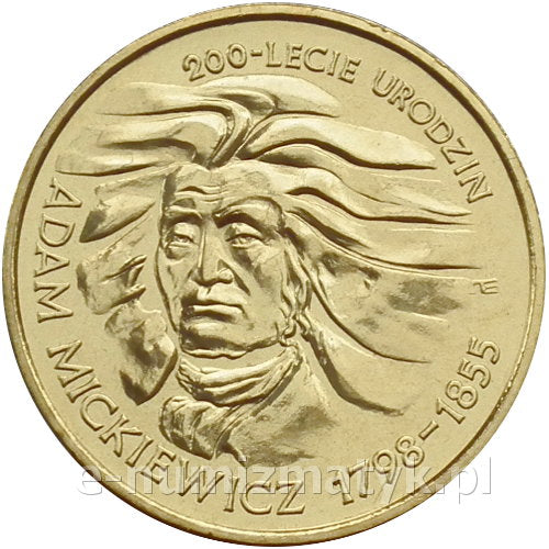 Moneta wydana z okazji 200-lecia urodzin Adama Mickiewicza. Na rewersie wizerunek głowy poety. Stan menniczy prosto z woreczka.