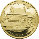Rewers - Stylizowane wizerunki dachów domów oraz kościoła farnego przy rynku w Kazimierzu Dolnym. U góry stylizowany wizerunek Góry Trzech Krzyży. U dołu półkolem napis: KAZIMIERZ DOLNY.