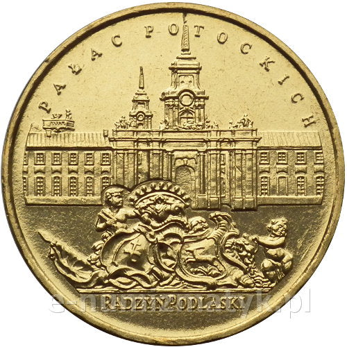 Moneta z serii "Zamki i pałace w Polsce" przedstawiająca Pałac Potockich w Radzyniu Podlaskim. Na rewersie wizerunek pałacu oraz heraldyczna kompozycja rzeźbiarska. Stan menniczy prosto z woreczka.