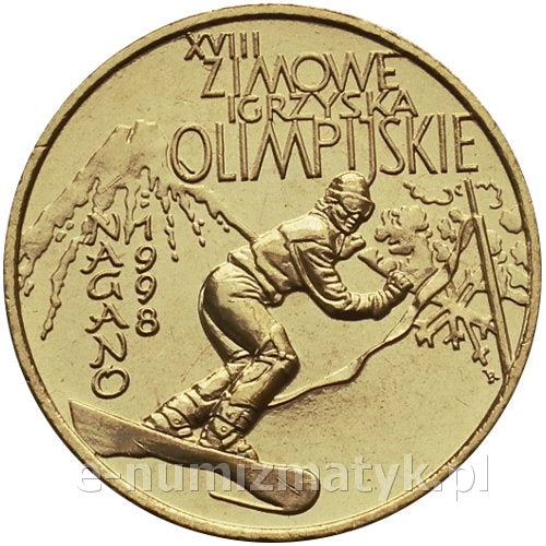 Moneta wydana z okazji XVIII Zimowych Igrzysk Olimpijskich w Nagano. Na rewersie wizerunek snowboardzisty na trasie zjazdu, w tle Fudżijama. Stan menniczy prosto z woreczka.